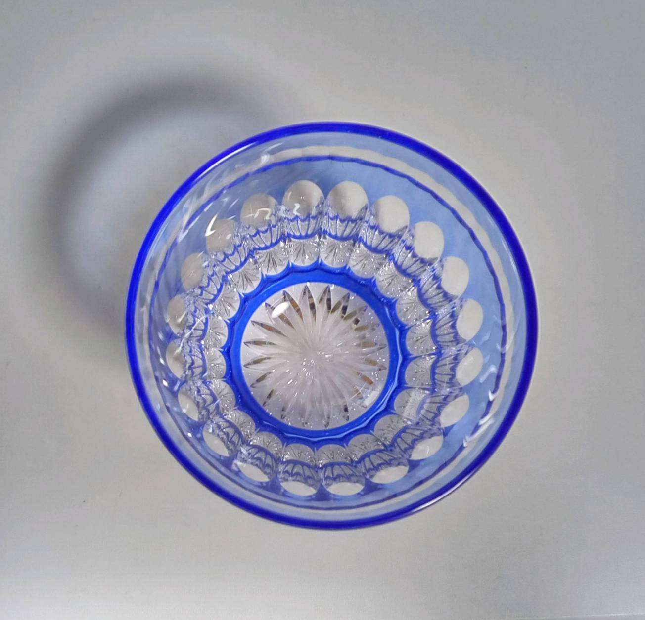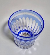ブルーの色被硝子と光を美しく反射させるカットとのコントラストが際立つロックグラス。上部に連なるのは人とのつながりを感じられる縁(円)。